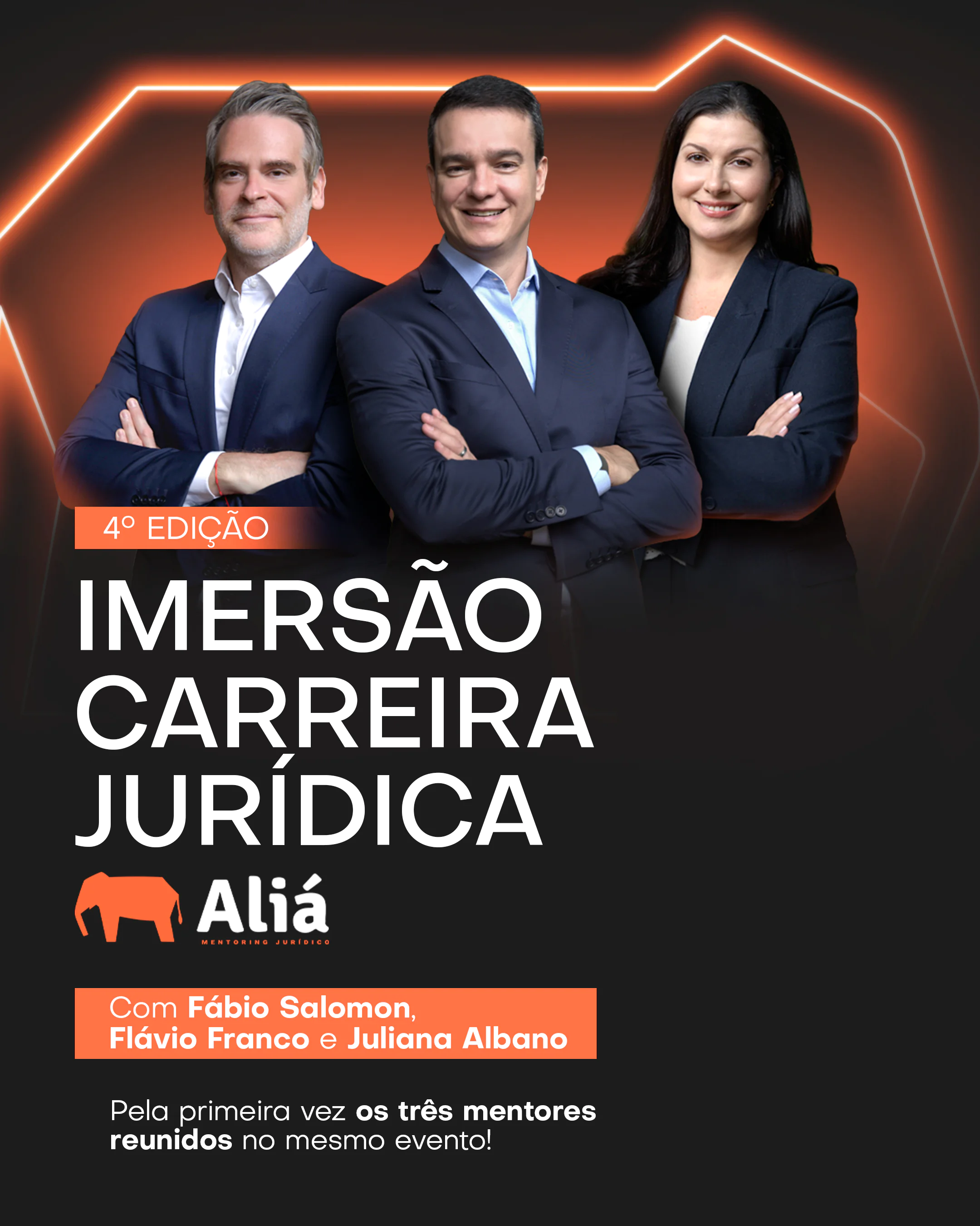 Esta edição marca um momento especial: pela primeira vez, os três mentores mais reconhecidos do mercado jurídico -- Fábio Salomon, Flávio Franco e Juliana Albano -- estarão juntos no mesmo evento, proporcionando uma experiência intensa de aprendizado, troca qualificada, direcionamento estratégico de carreira e conexão real com o que efetivamente move a advocacia contemporânea.