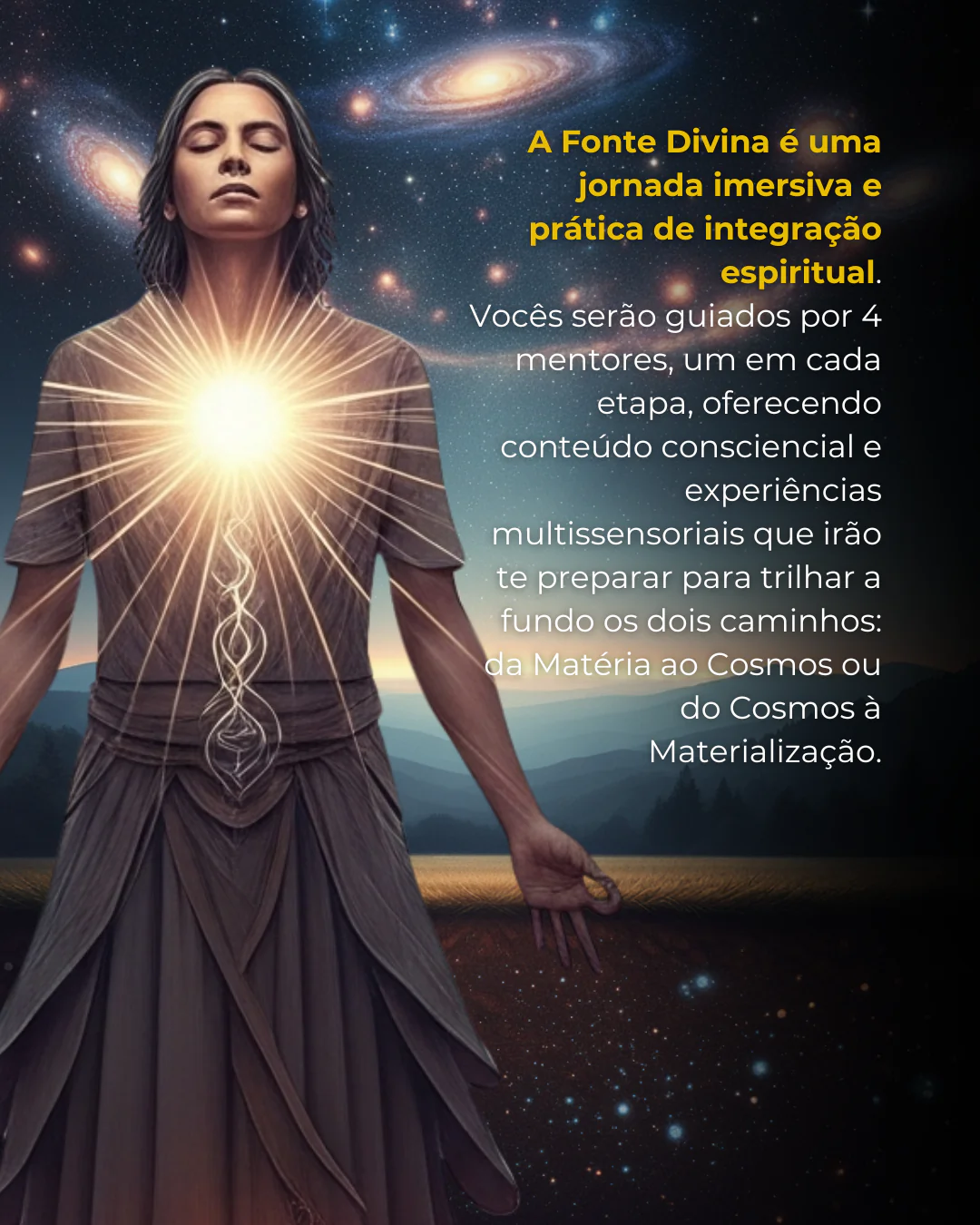 Vocês serão guiados por 4 mentores, um em cada etapa, oferecendo conteúdo consciencial e experiências multissensoriais que irão te preparar para trilhar a fundo os dois caminhos: da Matéria ao Cosmos ou do Cosmos à Materialização.