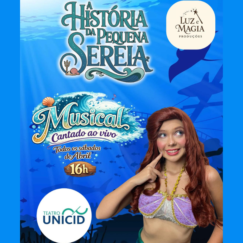 O espetáculo “A História da Pequena Sereia – O Musical ao Vivo” é uma experiência artística criada especialmente para o universo infantil. Nesta montagem, as crianças mergulham em um mundo colorido, alegre e cheio de fantasia, acompanhando a história da sereia Ariel em uma aventura cheia de música, luzes e personagens encantadores.