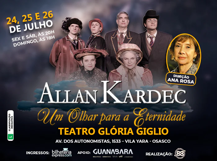Há 14 anos emocionando plateias em todo o Brasil, o espetáculo “Allan Kardec – Um Olhar para a Eternidade” consolidou-se como um verdadeiro fenômeno de público. Com sessões frequentemente esgotadas e uma turnê consagrada por onde passa, a montagem encanta espectadores pela sensibilidade, profundidade e excelência artística.