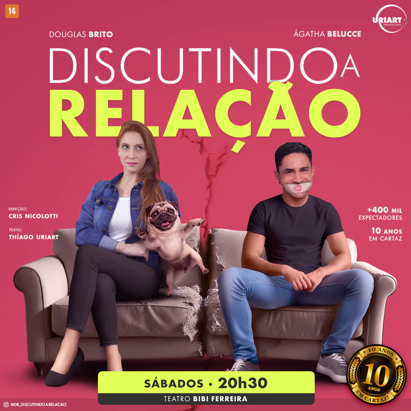 Espetáculo aclamado pelo público e pela crítica, comemorando 10 anos de sucesso em cartaz e mais de 400 mil espectadores por todo o Brasil, DR - Discutindo a Relação é uma deliciosa e divertida comédia romântica sobre a vida de um típico casal que vive em pé de guerra pelas coisas do dia a dia mas que no fundo se amam. Com muita leveza e piadas bem construídas e criativas, o casal Théo e Luiza resolvem levar para terapia todos os seus problemas de convivência, mas, o que era para ajudar acaba transformando a vida desses dois em uma emocionante e hilariante guerra dos sexos! Com muito bom humor, o casal retrata a maioria das dificuldades enfrentadas por diversos casais espalhados pelo mundo. Da toalha molhada em cima da cama as típicas cutucadas no meio de qualquer conversa, essa história vai te prender e fazer rir do início ao fim! Venha descobrir porque amar não é um privilégio para todos nessa irresistível história sobre um casal nada perfeito!