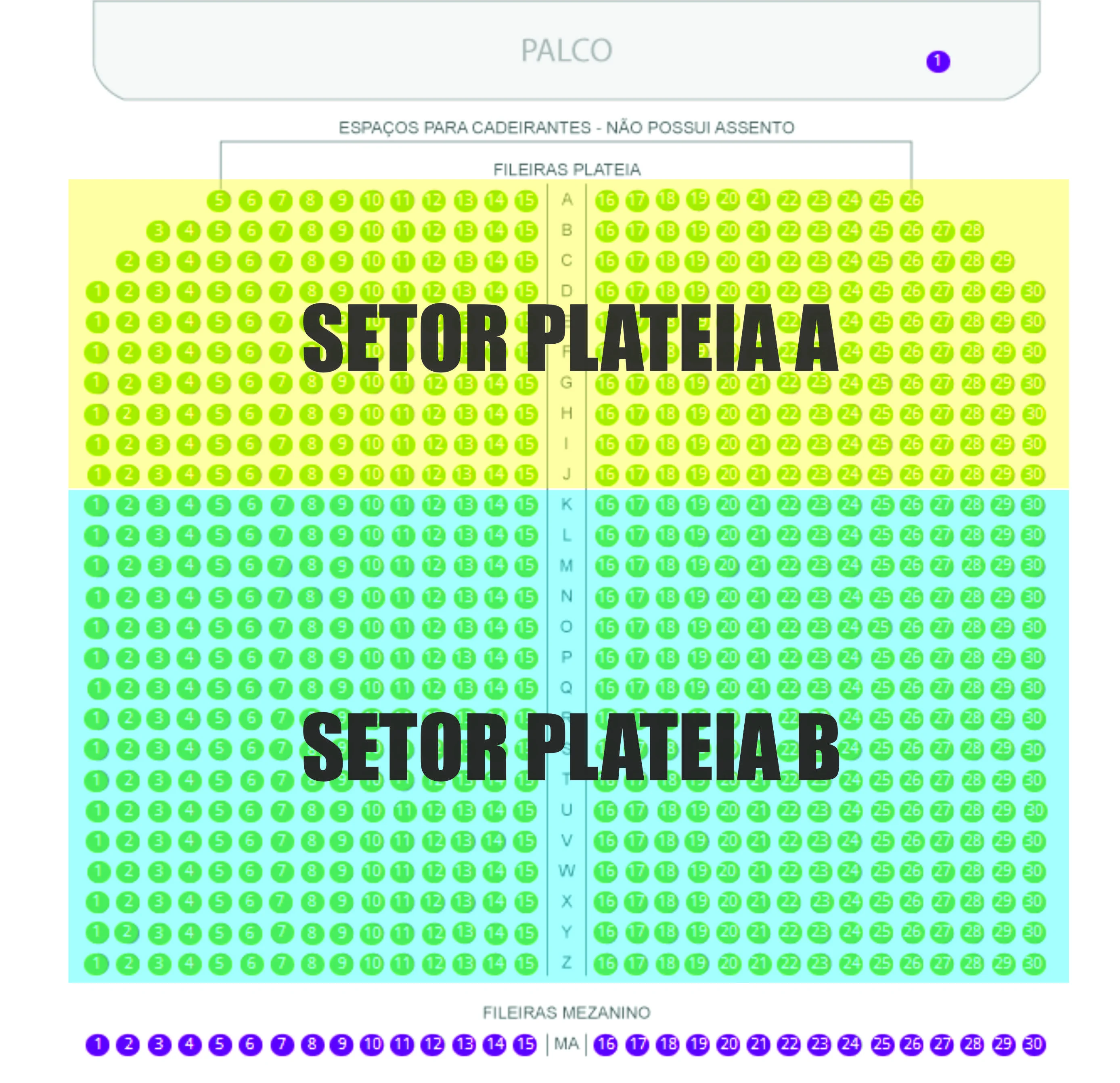 Setor Plateia A: Fileira A até H - Valores: R$90 - Antecipado | R$110 - Inteira | R$55 - Meia Entrada